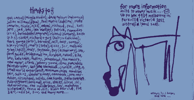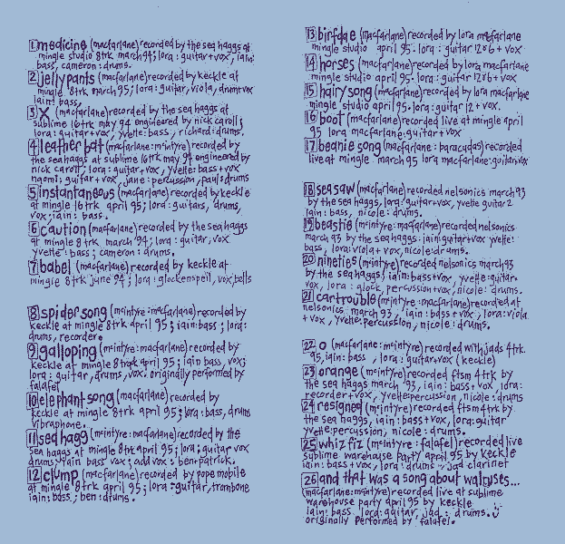 Released around 1995, this independent CD was a retrospective compilation of recordings from one Lora (later Laura) Macfarlane's various projects. These included the Sea Haggs and Keckle, some solo work, and one track by a band named Popemobile. The recordings were fairly lo-fi, containing elements that would be familiar to followers of Laura's subsequent Ninetynine work (jagged guitars, chromatic percussion, the odd cute melody and, of course, her distinctive vocals) and some that probably wouldn't (a recorder makes an appearance in a few places). The CD came with homemade packaging fashioned from pages cut out of children's books.